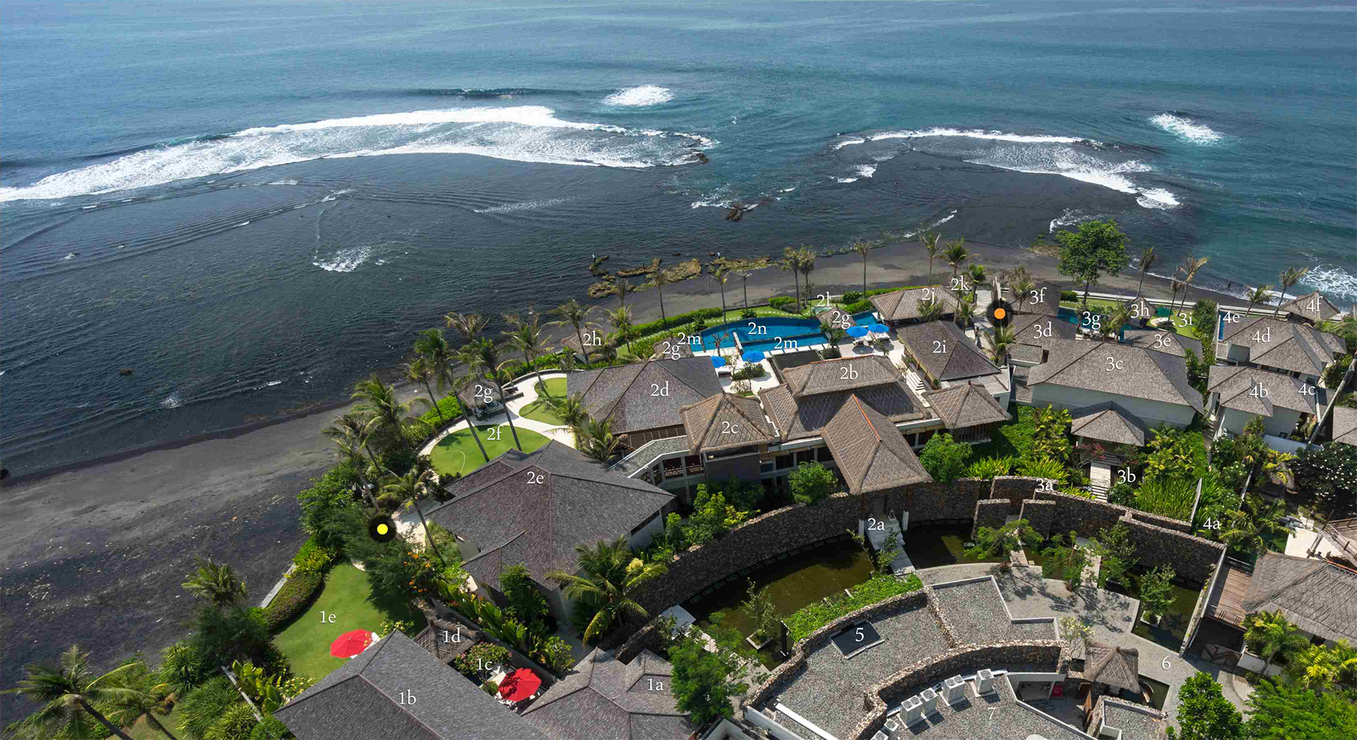 The villas are situated on a natural grayish-black sandy beach, providing a fresh and tranquil atmosphere. Guests can enjoy the sunrise with stunning backdrops of Bali’s mountains and direct views of Nusa Dua, Sanur, and Nusa Penida Islands.